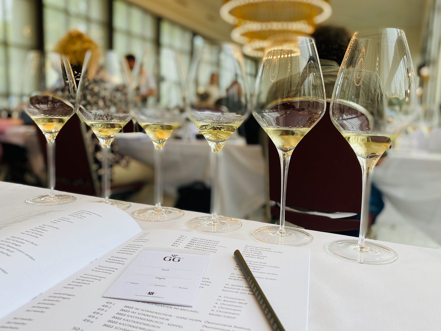 Once again, I have the privilege of attending this magnificent preview event, where the crème de la crème of German winemakers present themselves to industry insiders and unveil their new vintages. The Kurhaus Wiesbaden is the perfect location for this tasting. Everything feels so festive—the chandeliers, the aesthetics—and watching the illustrious audience of top sommeliers, merchants, trade press, and international wine critics as they sample the wines is equally impressive.